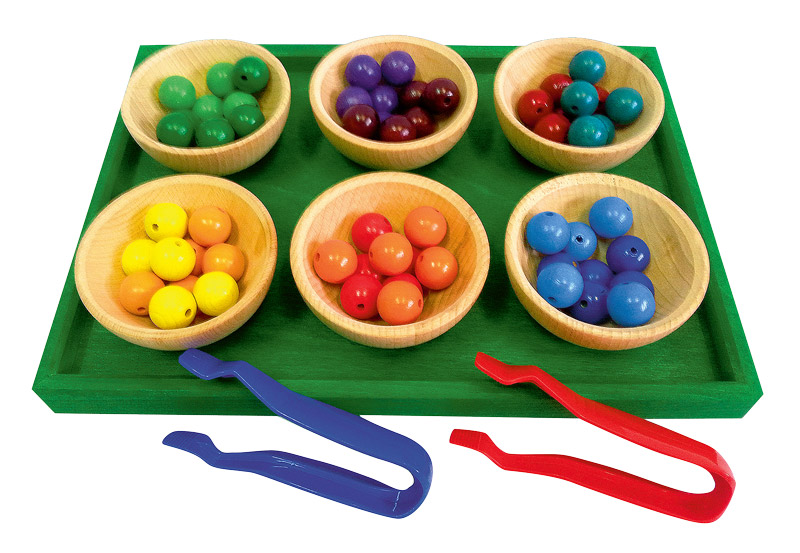 Die Holzperlen in den Schälchen werden mit Hilfe der Pinzetten hin- und her bewegt, gezählt, nach Farben geordnet... Ein ansprechendes Angebot, um das "Er-Greifen" zu lernen und zu üben.