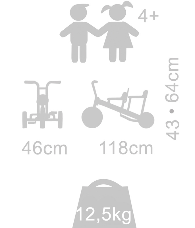 Mit dem Dreirad "Taxi" lassen sich Freunde und Freundinnen ganz bequem chauffieren. Zwei Sitze sind hintereinander angebracht und ein Antirutschbrett gibt einem dritten Passagier einen sicheren Stand. Eine Rückenlehne an den beiden Sitzen sorgt für besonderen Komfort.