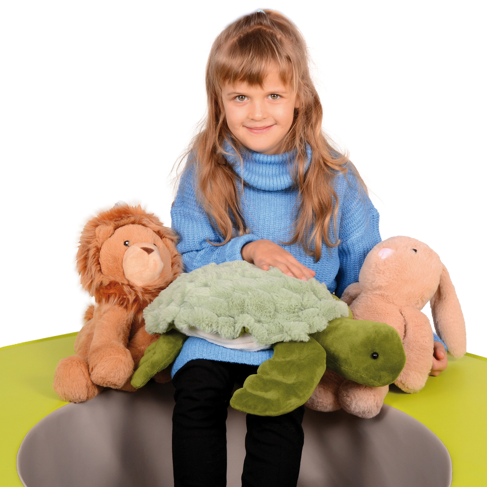 Das Gewichtstier Schildkröte „Siegfried“ (1,6 kg) ist ein besonderes Kuscheltier mit beruhigender Wirkung. Der weiche Plüschkörper besitzt einen Bauch, der mit Tonperlen gefüllt ist. Dadurch erhält das Tier ein angenehmes Gewicht, das Kindern beim Kuscheln Sicherheit, Ruhe und Geborgenheit vermittelt.