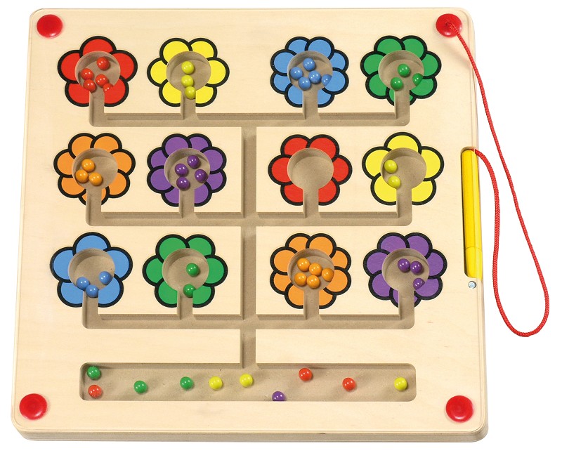 ... lernen Vorschulkinder ganz spielerisch mit diesemBoard. Auf der Blumenwiese werden die bunten Metallkugeln mit dem Magnetstift zu den Blüten in gleicher Farbe geführt. Dank der Plexiglas-Abdeckung fallen die Kugeln nicht heraus.
