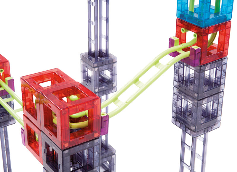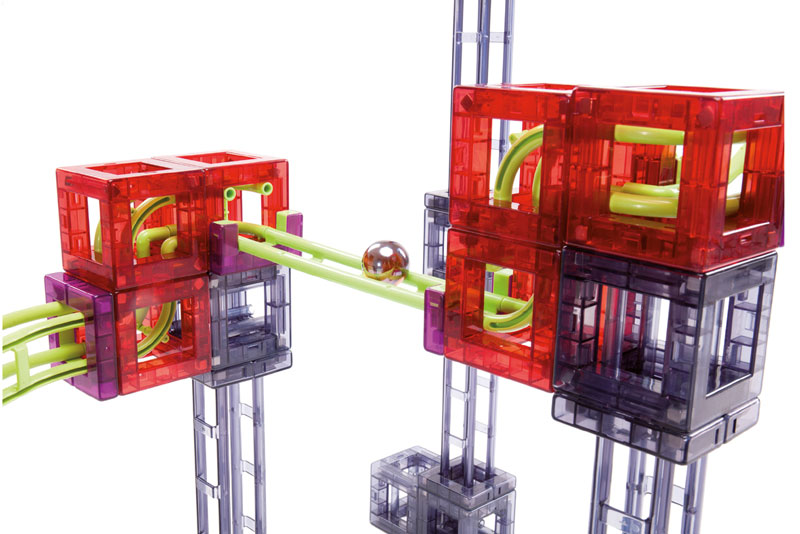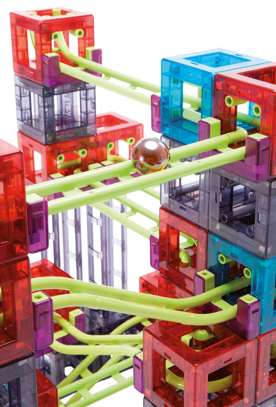 Kinder haben Spaß und sind fasziniert wenn Kugeln durch die immer wieder neu gebaute Varianten der Kugelbahn rollen. Größe Würfelelemente: 6 x 6 x 6cm. Länge Schienenelemente: ca. 18cm
