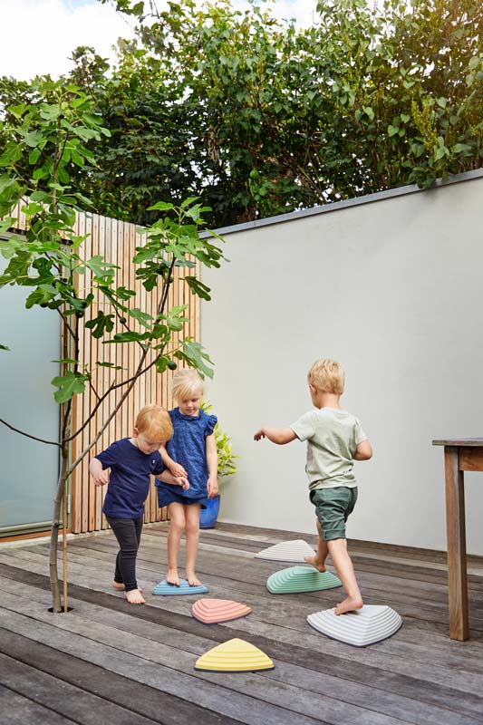 Als Alternative zu den beliebten Fluss-Steinen: Neue, subtil abgestimmte Farben schaffen eine bessere Übereinstimmung in einem großem Spektrum von Umgebungen. Hergestellt in der gleichen Qualität wie die originalen Fluss-Steine in den bekannten Kindergartenfarben, die natürlich weiterhin verfügbar sind. Jeder Stein hat eine umlaufende Gummikante, die ihn rutschfest macht und auf Böden keine Kratzer verursacht