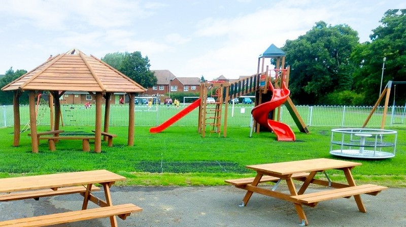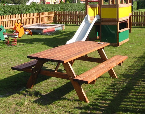 Eine Outdoor-Sitzkombination für den Spielplatz oder Außenbereich von Kita oder Kindergarten.