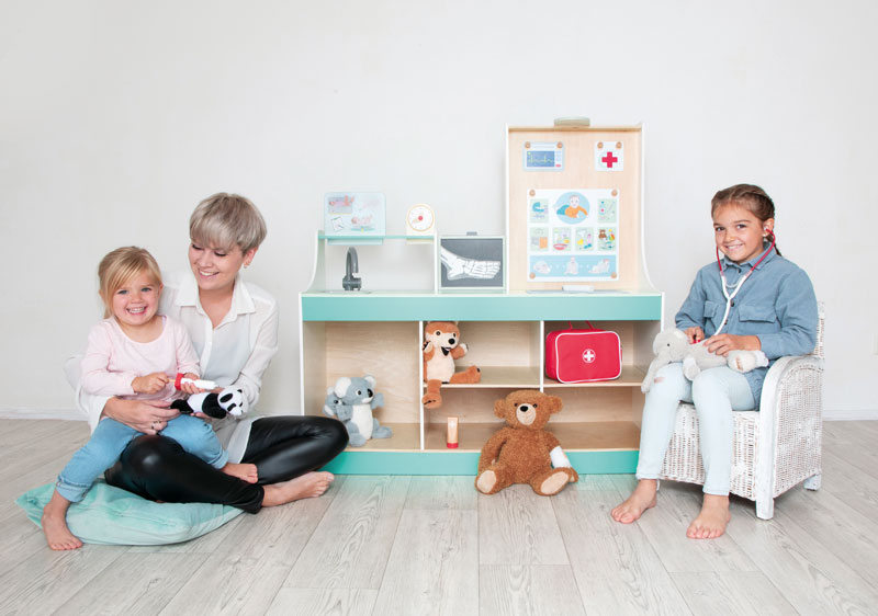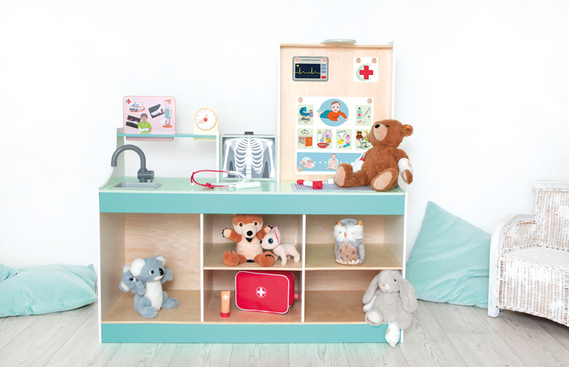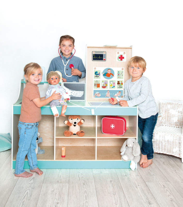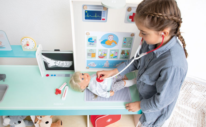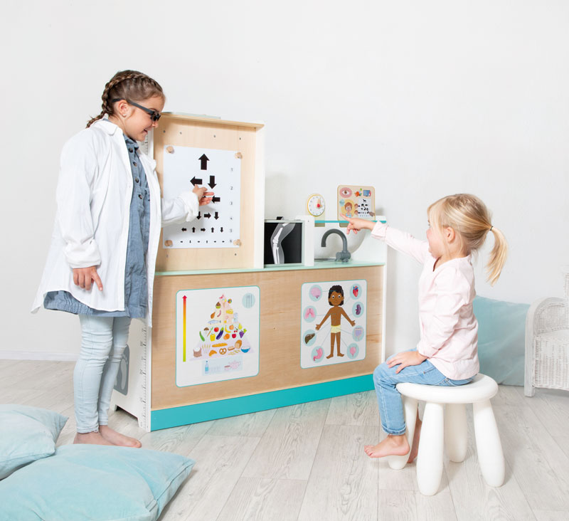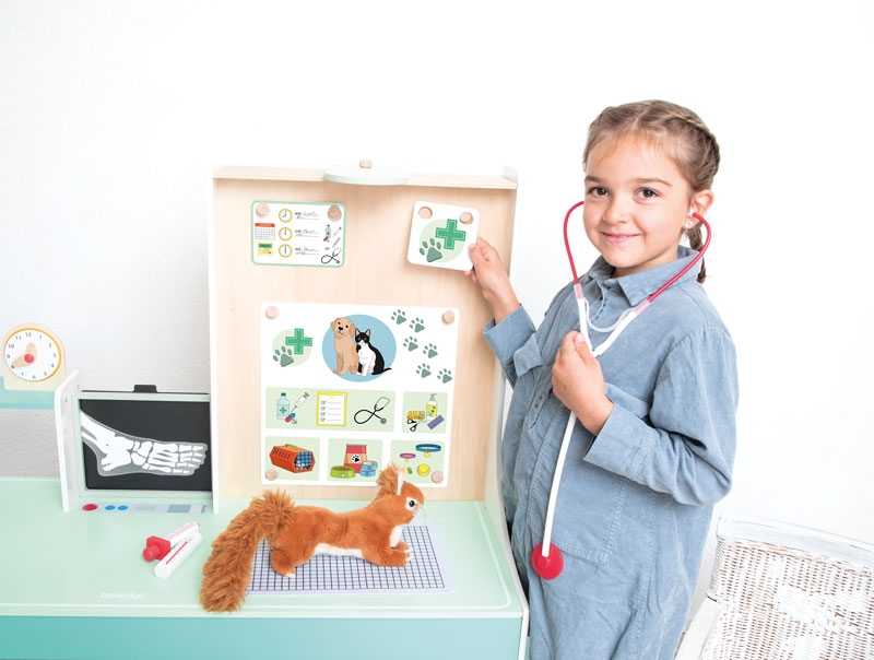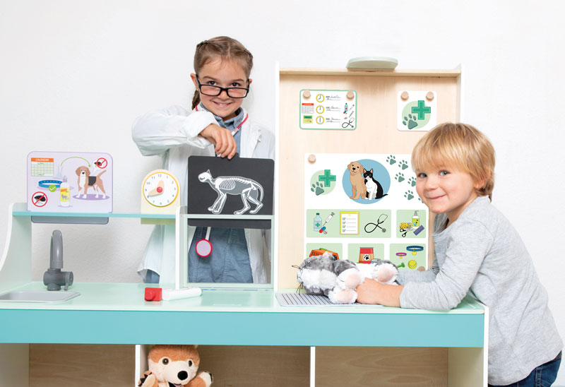 Die „Doctor Station“ lässt den Kindern viel Freiraum für kreatives und freies Rollenspiel. In welche Rolle schlüpfst du? Ideal für den Kindergarten. Es kann von beiden Seiten bespielt werden und bietet zahlreiche Möglichkeiten, wie zum Beispiel Durchführung von Sehtests, Größe messen und Röntgenbilder anschauen. Die Kinder können sowohl Kinderarzt, als auch Tierarzt spielen, da die Karten aus gewechselt werden können. Hierbei können Plüschtiere und Puppen als Patienten genommen werden.