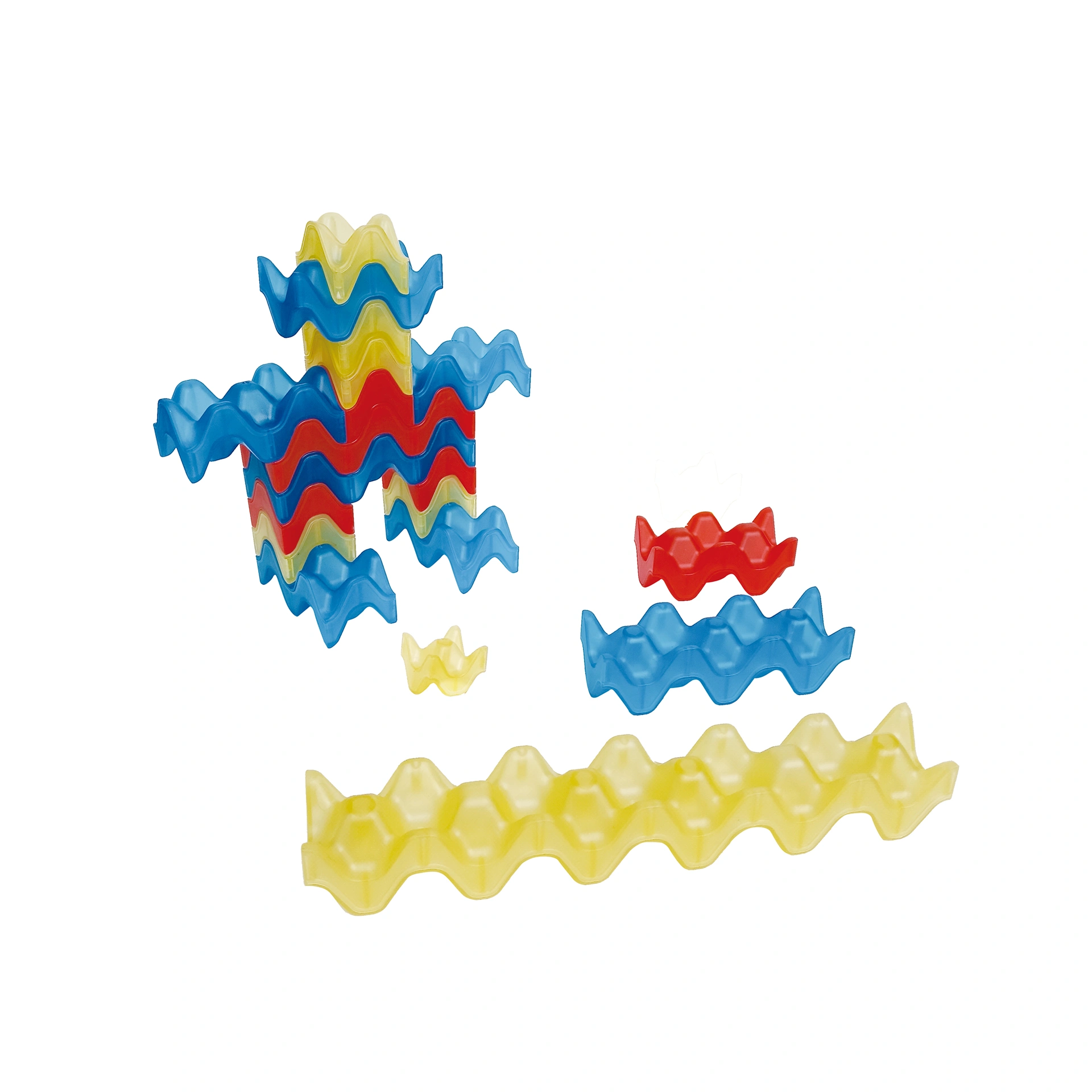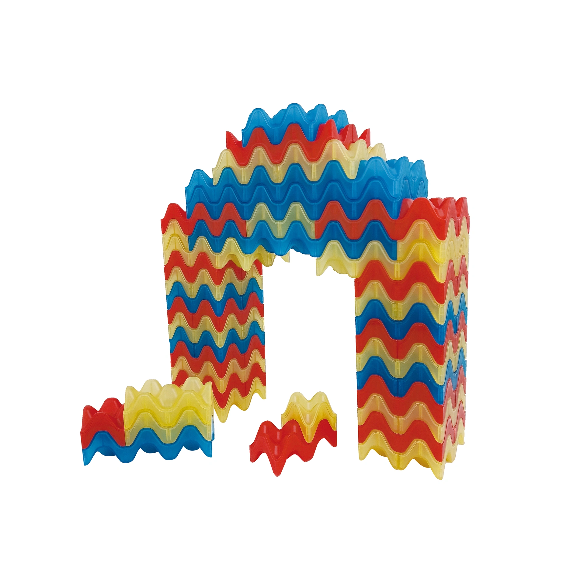 Das einzigartige wellenförmige Design ermöglicht ein nahtloses Ineinandergreifen der Bausteine und inspiriert Kinder zu kreativen, individuellen Konstruktionen. So werden spielerisch Muster, Strukturen und Zusammenhänge entdeckt.