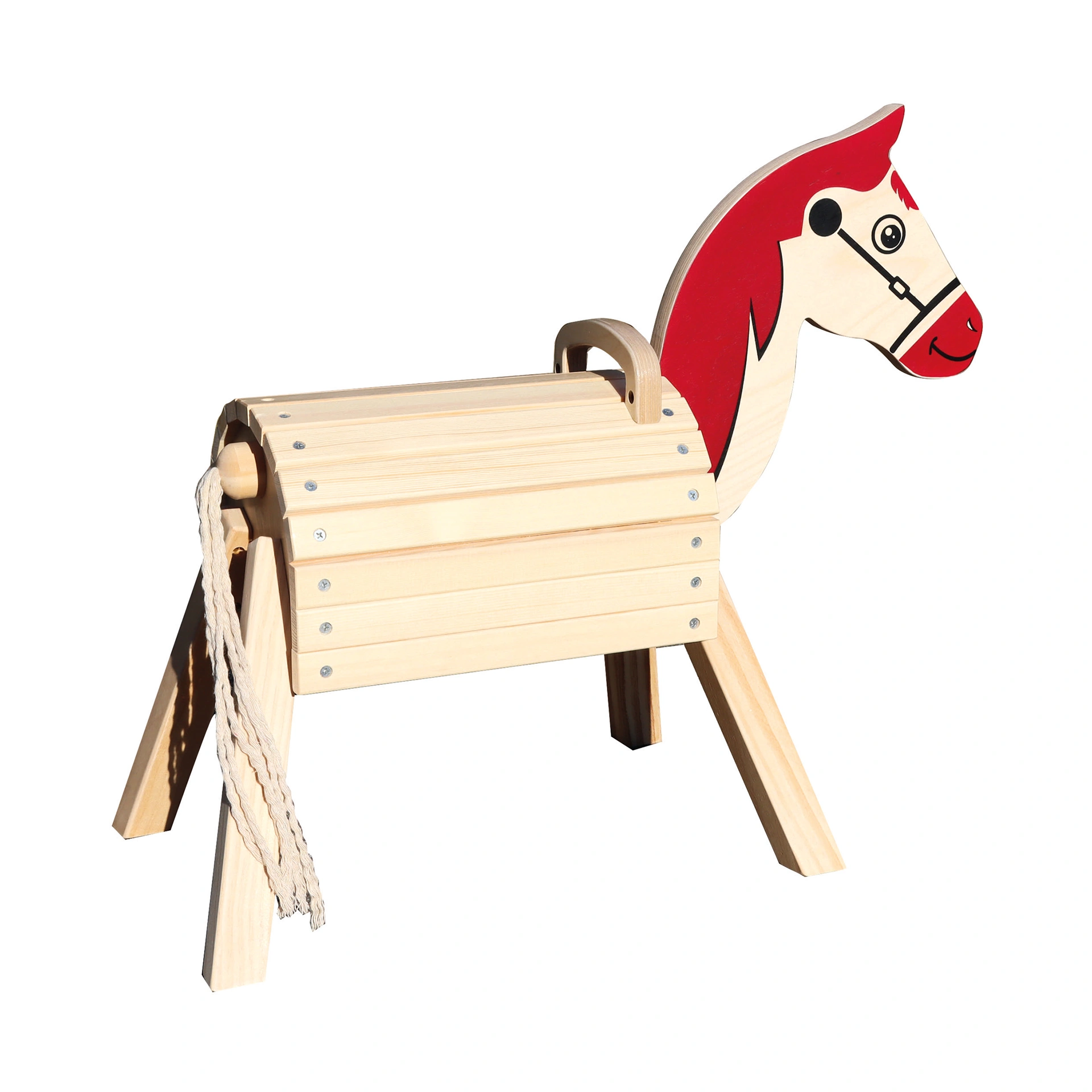 Das Holzpferd überzeugt durch seine hochwertige Verarbeitung, stabile Bauweise und ansprechende Bemalung. Nach einer Behandlung mit geeignetem Naturlack kann das Pony auch im Außenbereich eingesetzt werden.