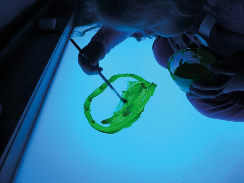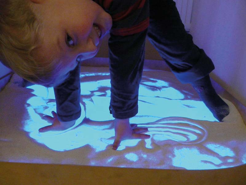 Das Malen und Gestalten auf der beleuchteten Fläche mit Materialien wie Gries, Reis oder Maismehl wird zu einer ganz besonderen Erfahrung. Das sanfte Licht wirkt beruhigend, während das Spielen mit unterschiedlichen Körnern, Muscheln oder Gegenständen ein intensives haptisches Erlebnis bietet. So werden Feinmotorik, Konzentration und Kreativität gezielt gefördert.