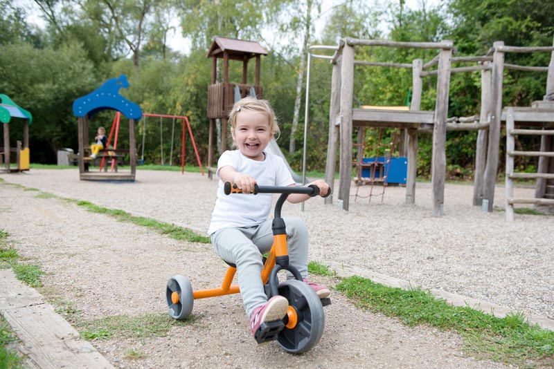 Mit dem kleinen Dreirad kann direkt losgefahren werden. Hier üben die Kleinsten die Koordination beim Treten und gleichzeitigen Lenken. Der intigrierte Griff im Sitz ermöglicht ein einfaches Handling.