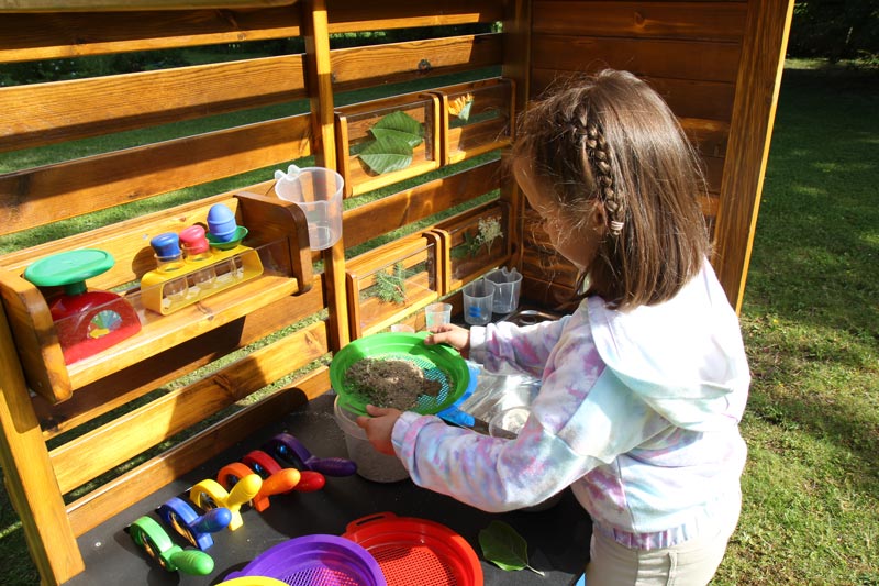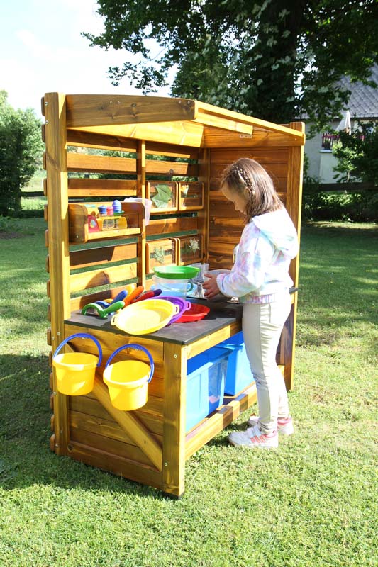Diese Experimentier- und Entdecker-Stationen lassen keine Wünsche offen. Kleine Naturforscher finden hier alles, was ein Entdecker benötigt. Im Garten aufgestellt, kann man bei jeder interessanten Entdeckung sofort auf die notwendige Ausrüstung zurückgreifen und das Objekt näher untersuchen. Im Set enthalten, sind folgende Utensilien: Wasserhahn und Wasserbecken, 3 Messbecher aus Kunststoff - für alle Experimente die Wasser benötigen z. B. Gold waschen, Untersuchungsobjekte reinigen u.v.m., Kartenset 16teilig – die Karten zeigen verschiedene Objekte aus der Natur; 2 Karten bilden ein zusammengehöriges Paar z. B. zum Thema Lebensraum (ob richtig geordnet wurde, zeigt der farbige Punkt auf der Rückseite). Die Karten können in den Sichtboxen an der Rückwand der Station eingeordnet werden. Die leeren Sichtboxen können auch zur Ausstellung von gesammelten Materialien verwendet werden (z. B. Blätter, Gräser, Muscheln…), Lupen-Set, 6-teilig – zur vergrößerten Darstellung der Untersuchungsobjekte, Eimer, 3 Stück, Waage mit Messbecher, Pipetten, Reagenzgläsern mit Ständer, Kunststoffbehälter, Siebe, 5 Stück,
