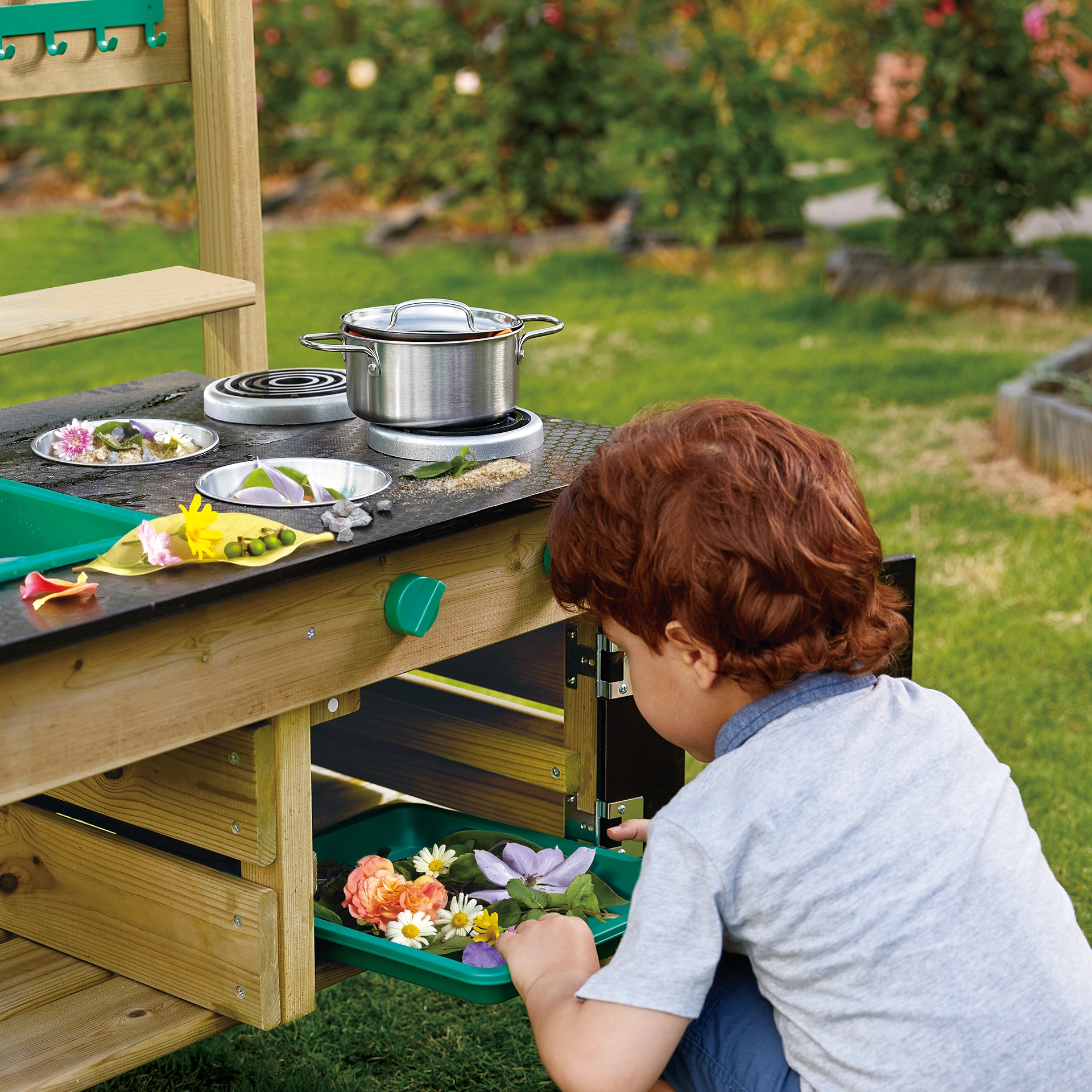 Die integrierte Tafelfläche eignet sich perfekt, um das Menü des Tages anzukündigen oder kleine Zeichnungen zu machen. Zwei Blumentöpfe bieten zusätzlich Platz, um Kräuter oder kleine Pflanzen zu setzen und spielerisch zu pflegen.