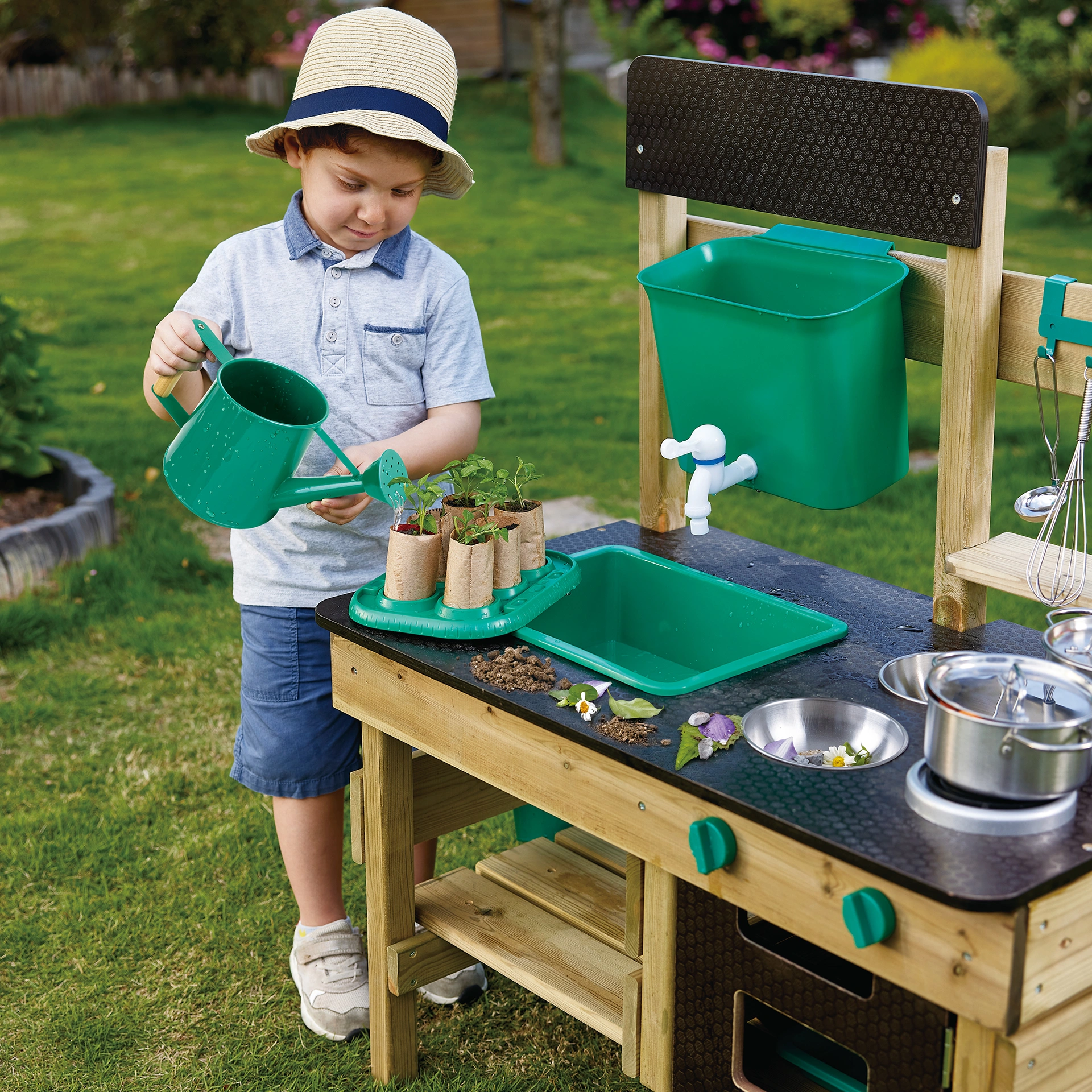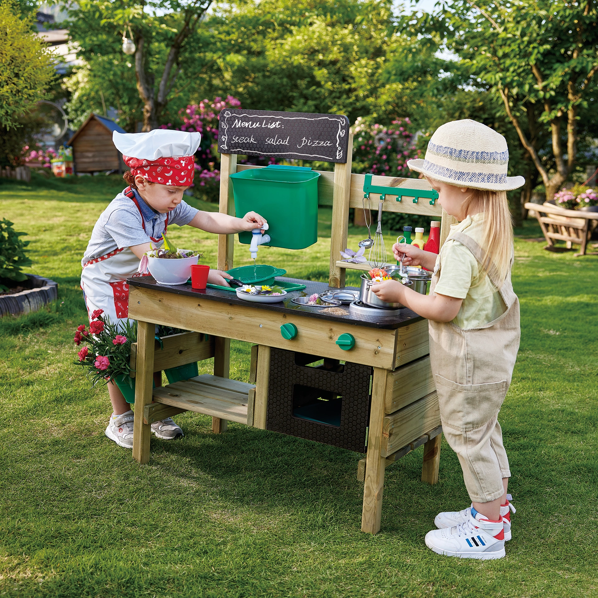 - Inhalt: 1 Outdoor Spielküche (Bausatz), 12-teiliges Zubehör Set mit Wassertank, Schüsseln, Pflanztöpfen und vielem mehr