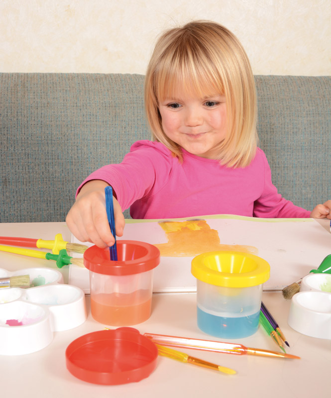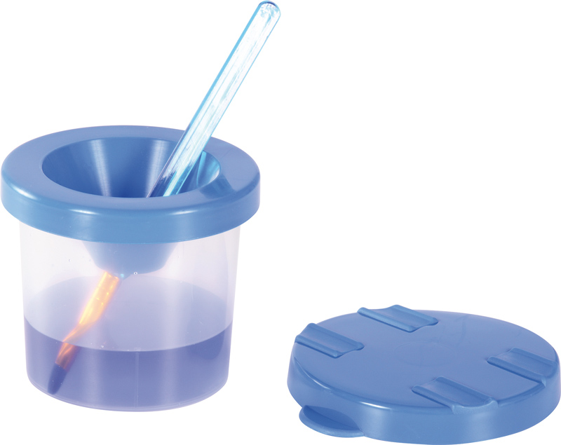... mit diesem Pinselbecher. Der Pinsel steht sicher im trichterförmigen Einsatz. Durch den Deckel kann das Wasser verschüttsicher transportiert werden. Set: Becher, Trichter, Deckel.