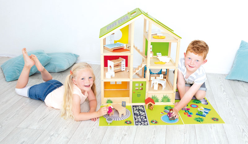 Voll ausgestattet! Ein Highlight für alle Kids! Das mehrstöckige Puppenhaus hat sechs Zimmer und sogar einen Außenbereich. Hier ist viel Raum für Kreativität. Die beiden Textilmatten für den Außenbereich sind ein Hingucker. Mehrere Kids können so zusammen spielen. Es bietet viel Platz. Das Dach kann von den Kindern selbst aufgelegt werden.