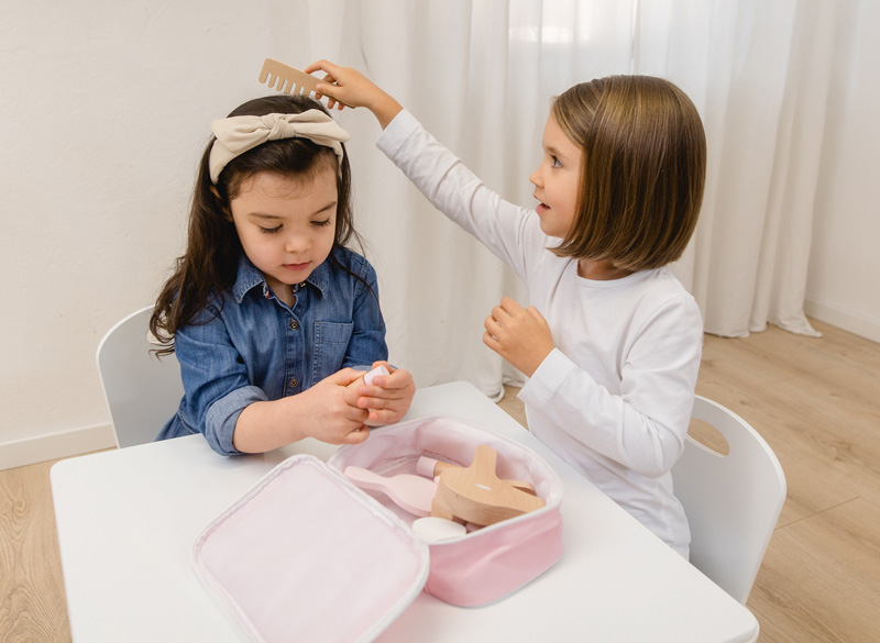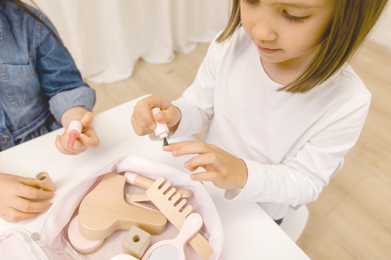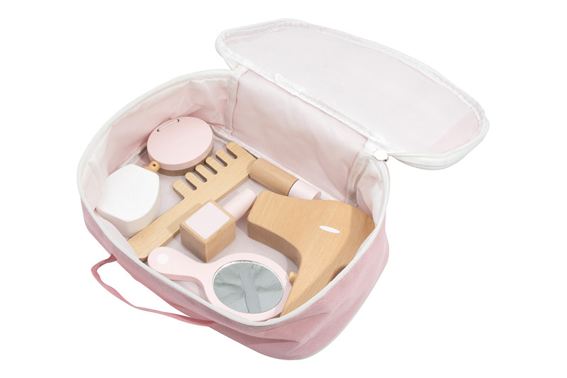 Die hochwertigen Holzaccessoires sind nicht nur besonders langlebig, sondern dank FSC®-Zertifizierung auch umweltfreundlich hergestellt. Föhn, Glätteisen, Kamm, Parfüm, Handspiegel, Taschenspiegel, Nagellack und Lippenstift sehen täuschend echt aus und regen Kinder zu fantasievollen Rollenspielen an. So wird nicht nur die Feinmotorik gefördert, sondern auch das soziale Miteinander beim Spielen mit Freunden oder Geschwistern.