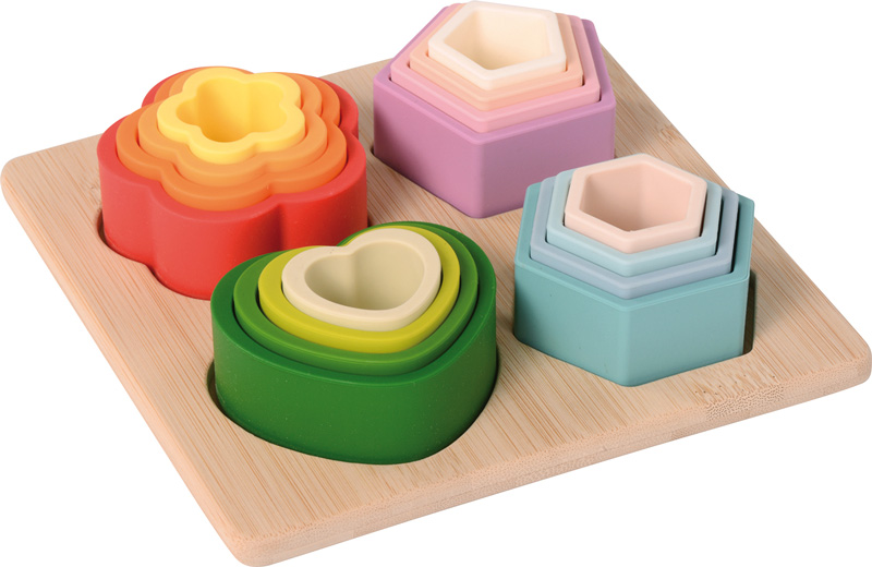 ... Die weichen Stapelformen aus Silikon sind für Kids nicht nur angenehm zu greifen - sie begeistern durch ihren hohen Spielwert: mit ihnen lernen Kinder Farben und Formen kennen, sie können Türme Stapeln, nach Größe sortieren und die passende Vertiefung auf dem Bambusbrett finden. Auf der Oberseite sprechen erhabene Herzen, Blumen, Fünfecke und Sechsecke den Tastsinn an. Das Spiel fördert feinmotorische Fähigkeiten und logisches Denken. Reinigung der Stapelsteine in der Spülmaschine.