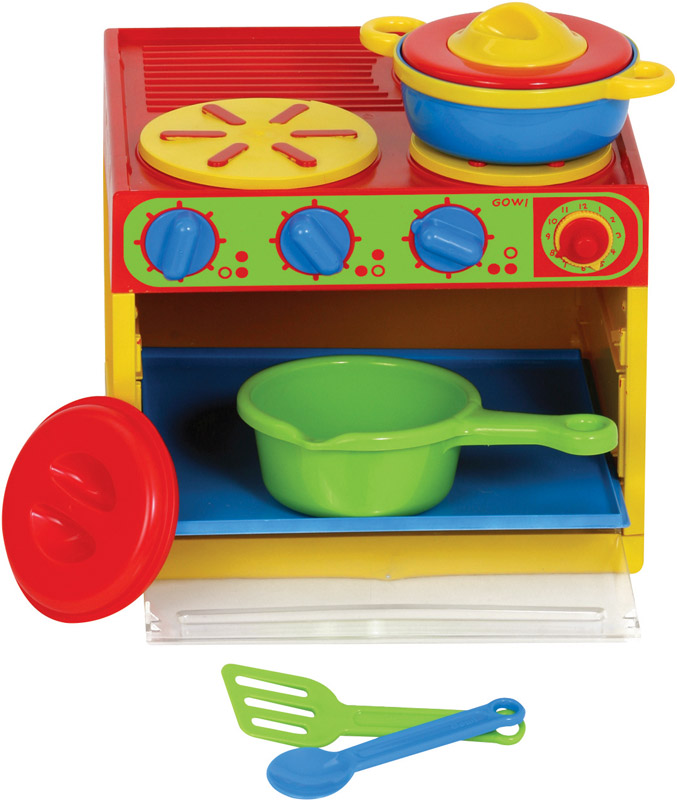 Gowi Kinderküche Herd mit Backofen + KochserviceBackofen mit Herdplatte bestehend aus 2 Töpfen mit Deckeln, 1 Löffel, 1 Pfannenwender. Ideal für beengte Platzverhältnisse bzw. dem Spiel am Tisch.