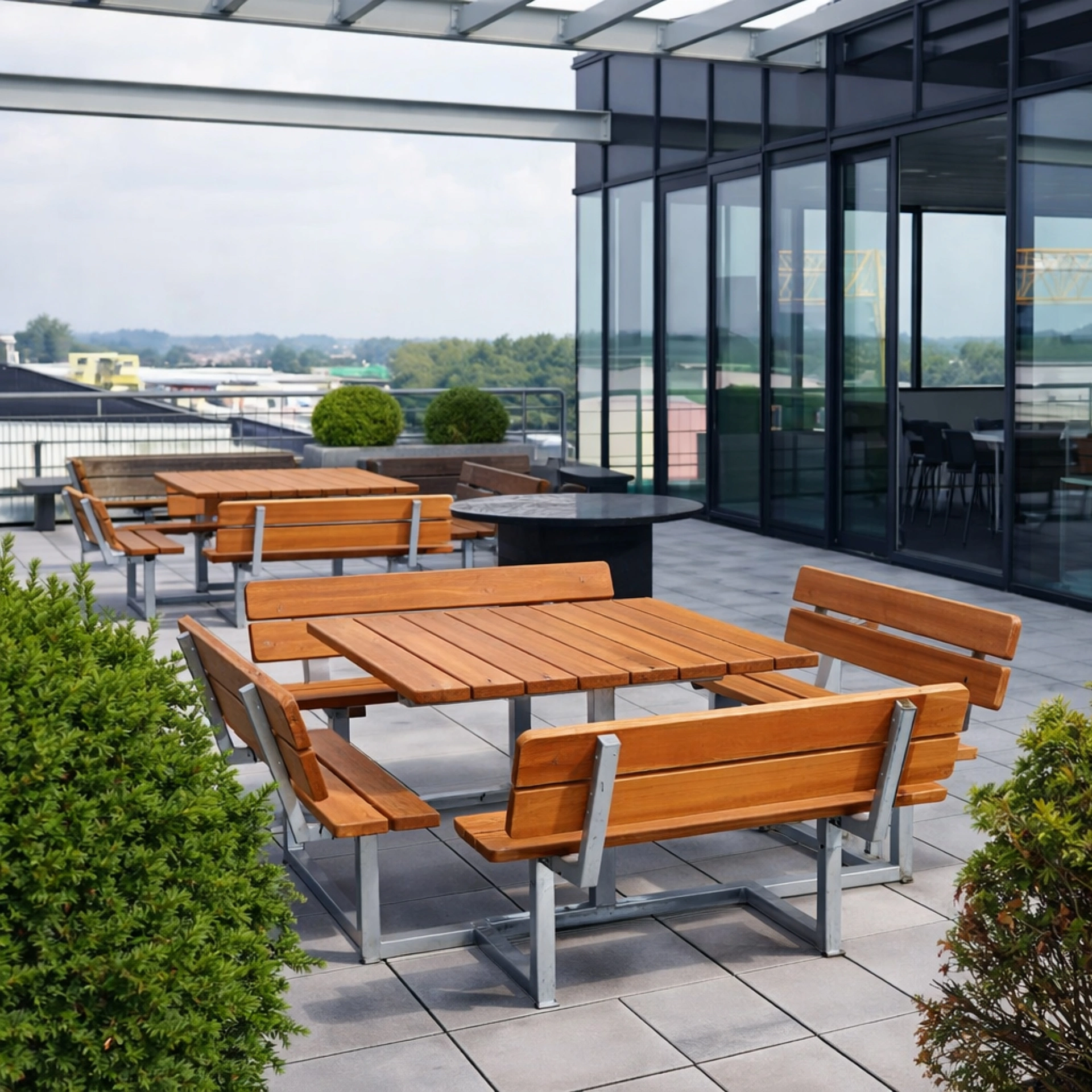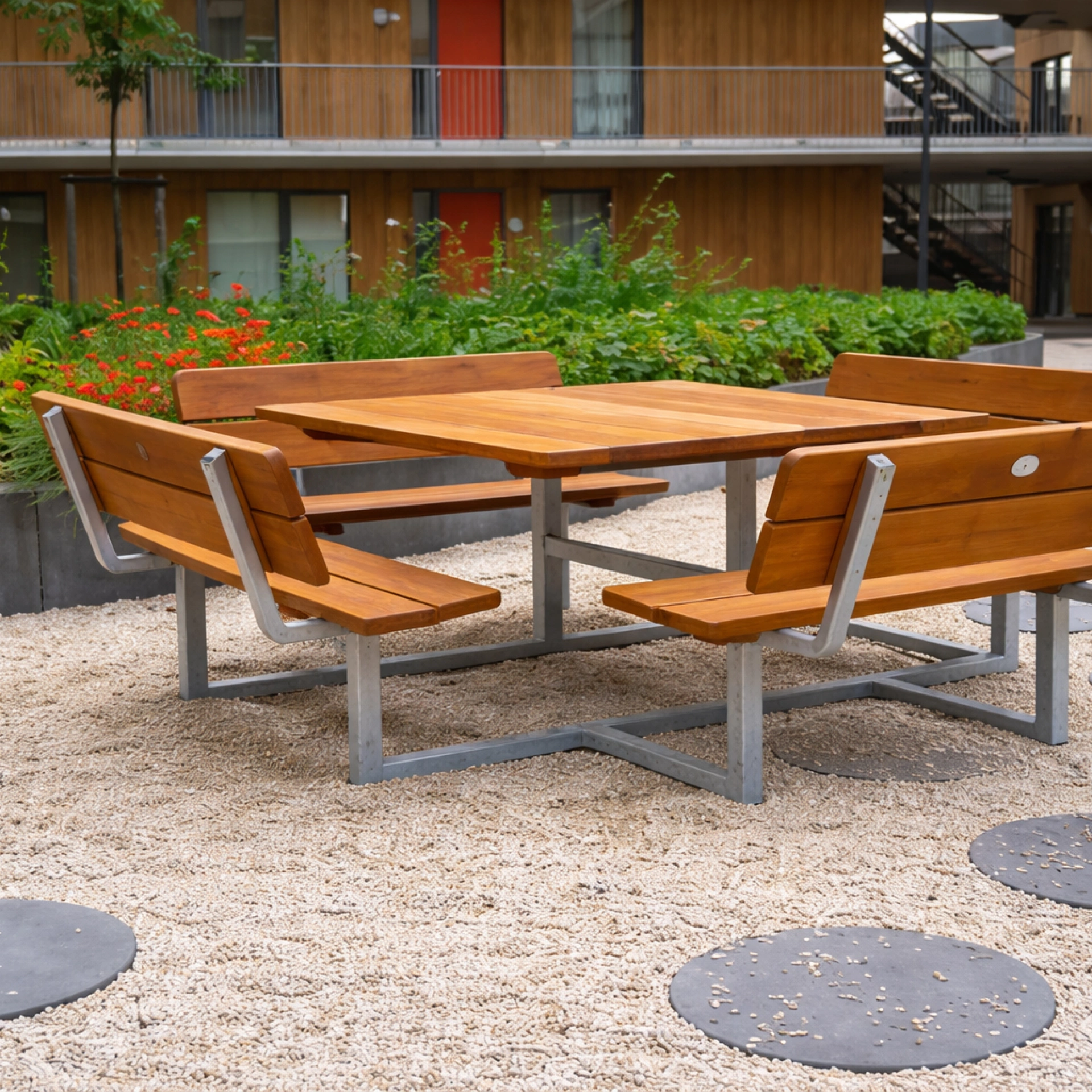 Dank der Verwendung von hochwertigen, wetterfesten Materialien überzeugt die Garnitur durch ihre Langlebigkeit und Widerstandsfähigkeit – auch bei intensiver Nutzung im öffentlichen Raum.