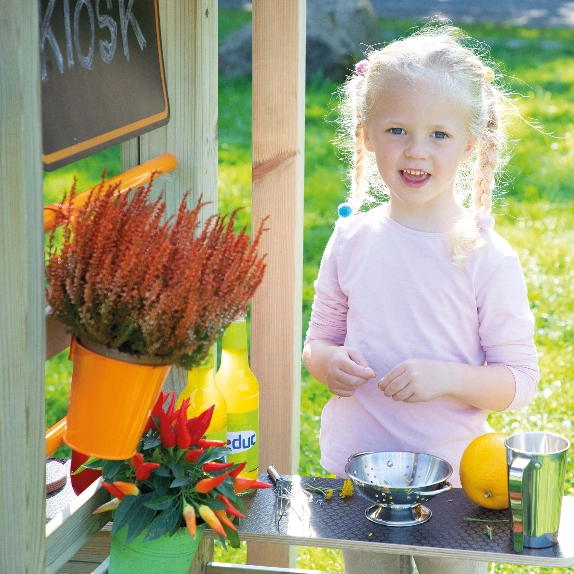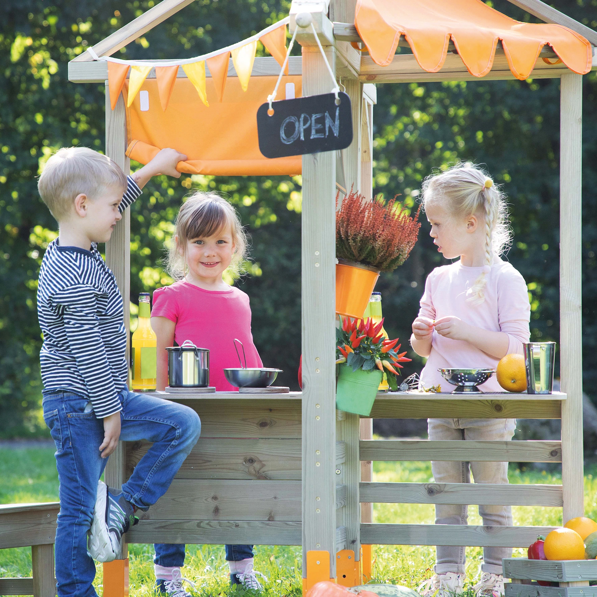 Das Spielhaus Kiosk bringt fantasievolle Rollenspiele nach draußen. Ob Kiosk, Marktstand, Eisdiele oder Imbiss – Kinder können hier ihre eigenen kleinen Welten erschaffen und gemeinsam spielen.