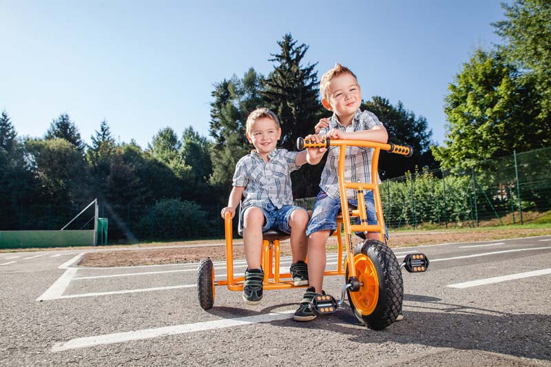 Der Beifahrer kann dabei die Aussicht nach vorne genießen, was das gemeinsame Fahrerlebnis noch spannender macht. Gleichzeitig fördert das Fahrzeug soziales Miteinander, Kommunikation und Teamspiel.