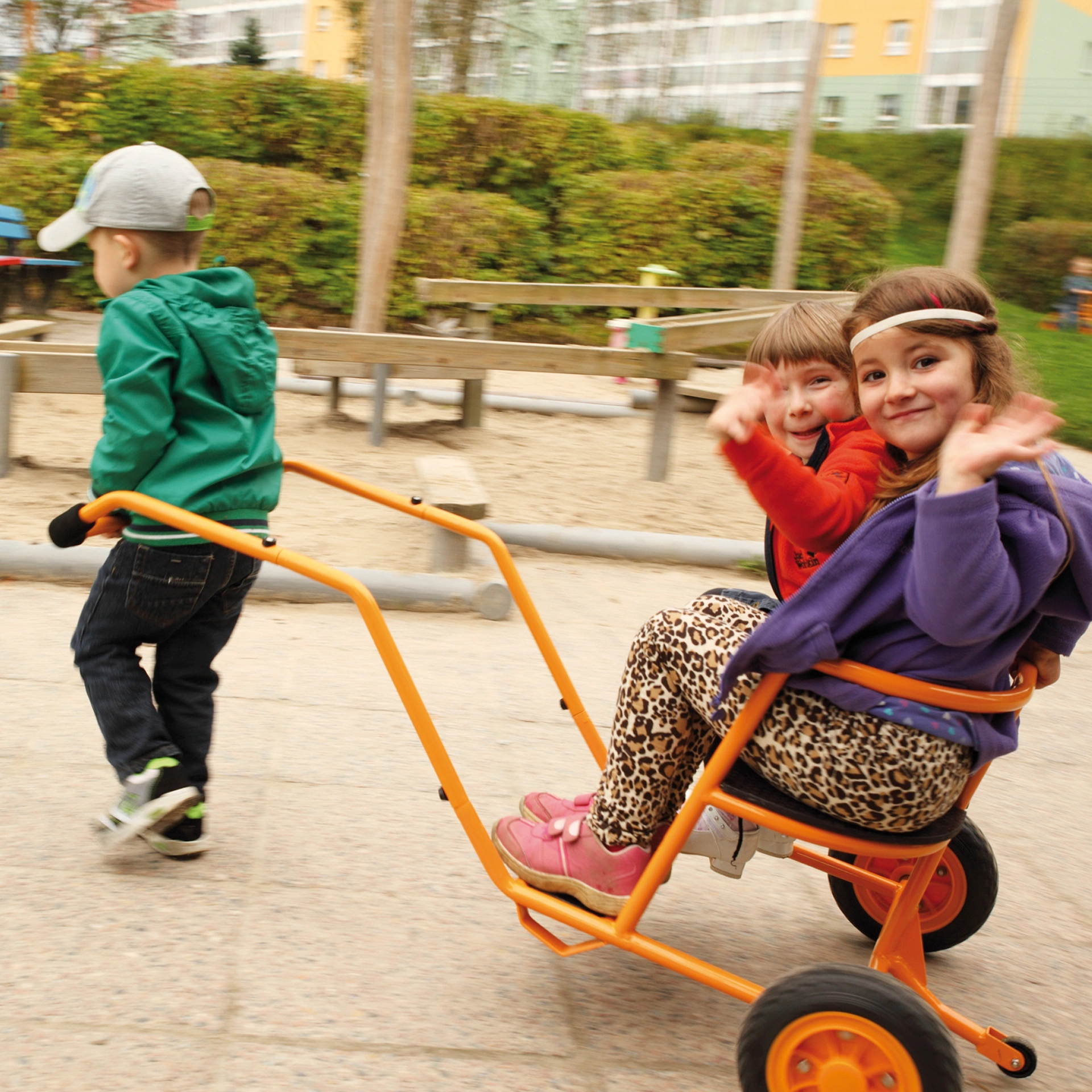 Die Rikscha fördert spielerisch Koordination, Teamarbeit und Motorik und ist damit perfekt für den Einsatz im Kindergarten, auf dem Spielplatz oder im Außenbereich geeignet.
