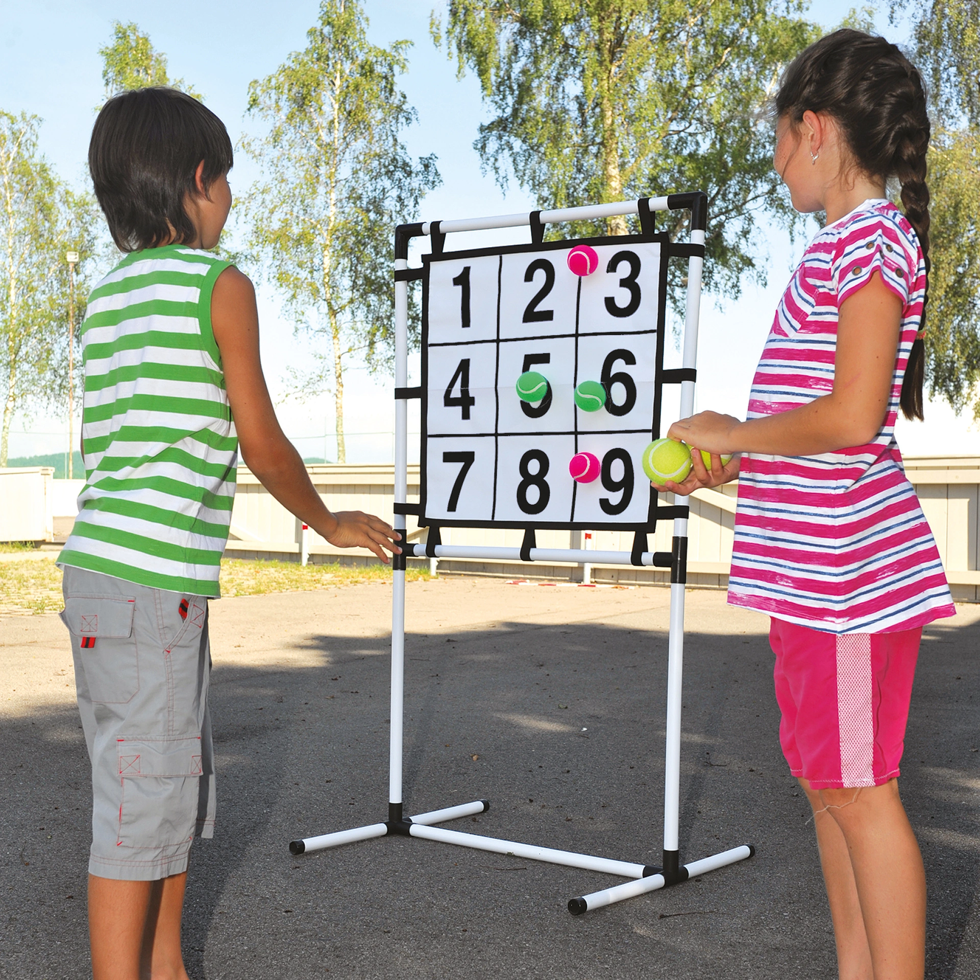 Kinder werfen die Klettbälle auf die Scheibe und sammeln Punkte – wer am Ende die höchste Gesamtpunktzahl erreicht, gewinnt. Dabei sind Konzentration, Geschicklichkeit und eine ruhige Hand gefragt.