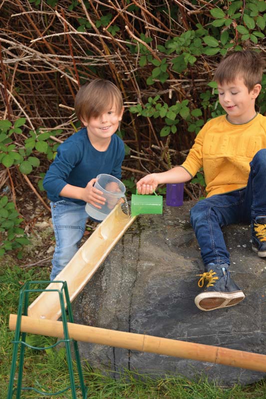 ... Im Nu ist aus den vier Bambus Rinnen eine Wasserbahn gebaut und dann heißt es: Wasser marsch! Bei der Konstruktion können verschiedene Bauteile miteinander kombiniert werden, um Gefälle zu erzeugen (Wasserbahn Ständer), um Wasser umzuleiten (Bilibo) und um das Wasser aufzufangen (Kunststoffkiste). Ob es eine lange gerade Bahn mit viel Gefälle oder eine flache Zickzack-Bahn werden soll, in der das Wasser langsam fließt, können die Kinder immer wieder neu beim Bau entscheiden. Natürlich kann die Bahn beliebig erweitert werden - je länger die Wasserbahn desto größer ist der Spielspaß. Lieferung ohne Deko/Zubehör.