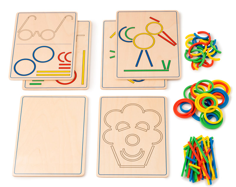 ... Figuren aus Ringen und Stäbchen in unterschiedlichen Farben legen. Die Aufgabenkarte nachlegen oder eigene Kreationen erfinden. Fördert Feinmotorik und räumliches Vorstellungsvermögen. Inhalt: 6 Aufgabenkarten mit 11 Aufgaben, 100 Formen in 4 Farben, Gebrauchsanweisung.
