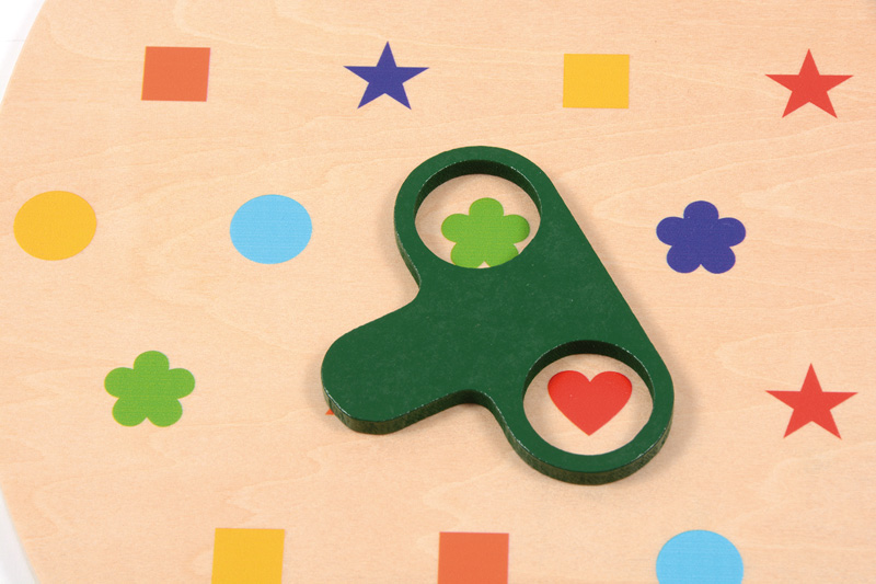 Das Spiel fördert das Erkennen von Farben und Formen. Die Kinder ziehen einen Holzchip oder würfeln und suchen dann mittels der Schablone die beiden angezeigten Symbole auf dem Board. Dabei werden Konzentration, logisches Denken und die visuelle Wahrnehmung gefördert. Für noch mehr Spannung kann das Spiel auch mit einer Sanduhr (nicht enthalten) gespielt werden. Set: 1 rundes Holzboard bedruckt mit Symbolen, 48 Holzchips, 2 Würfel mit Symbolen, 2 Schablonen-Werkzeuge.