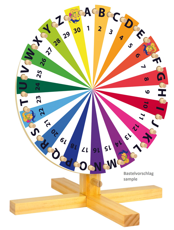 ... denn Sie können die 5 Blanko-Kartons für das Glücksrad selbst Gestalten: mit Zahlen, Buchstaben, Spielideen, Tieren, Märchenfiguren, Sport-Übungen, Wer-ist-dran-Aufgaben ... So ist das Glücksrad immer interessant: Beim Addieren- oder Buchstabieren-Üben, als Ideengeber beim Improvisationstheater oder als Glücksrad beim Sommerfest. Einfach das entsprechende Motiv mit der Holzschraube auf der Platte befestigen - schon ist das Rad fertig zum Dreh. Mal sehen, an welchem Holzstift der Stopper stehen bleibt.