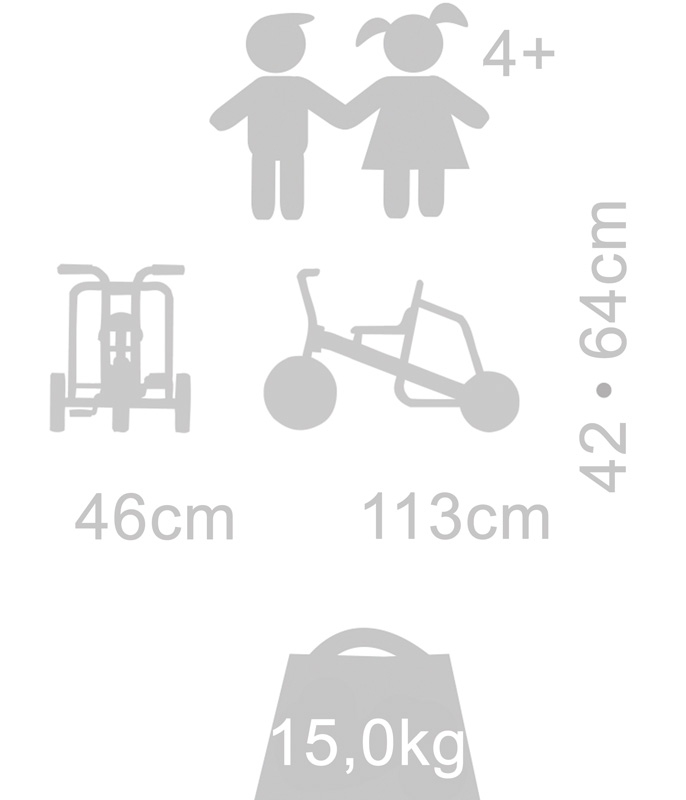 Achtung! Die Montage muss von Erwachsenen vorgenommen werden. Es besteht Verschluckungsgefahr für Kinder unter 3 Jahren – enthält vor der Montage kleine Teile. Die kontinuierliche Beaufsichtigung durch einen Erwachsenen ist erforderlich; niemals in der Nähe motorisierter Fahrzeuge benutzen; niemals in der Nähe von Straßen, Schwimmbecken, Hügeln, Treppen oder abschüssigen Auffahrten verwenden. Beim Fahren mit diesem Dreirad sind immer Schuhe zu tragen. Nie mehr als 3 Fahrer zulassen. Sitz Tragkraft 50 kg max. Tragkraft der rückseitigen Plattform nur für ein Kind, max. 50 kg