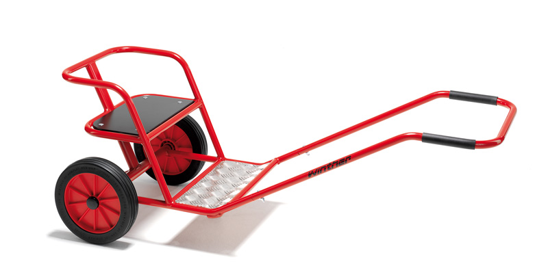 Winther VIKING Sulky Für Kinderkrippe, Kleinkindgruppen, Tagesmütter, Familien und andere Institutionen! Wer 'spannt' sich vor den Sulky? Ein Kind ist Passagier, während ein anderes Kind zieht - natürlich im Wechsel! Sitz mit Festhaltebügel, rutschfestes Aluminiumtrittbrett und ein kleines Stützrad, um Kippen zu vermeiden.